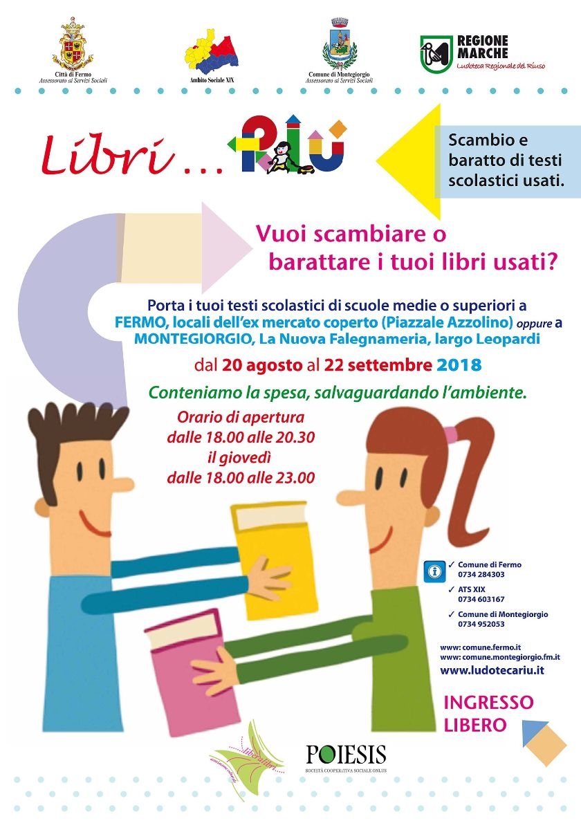 E' possibile scambiare o barattare i libri scolastici usati di scuole medie o superiori da Lunedì 20 Agosto a Sabato 22 Agosto presso i Locali dell'ex Mercato Coperto (Piazzale Azzolino) o alla Nuova Falegnameria a Montegiorgio (Largo Leopardi).