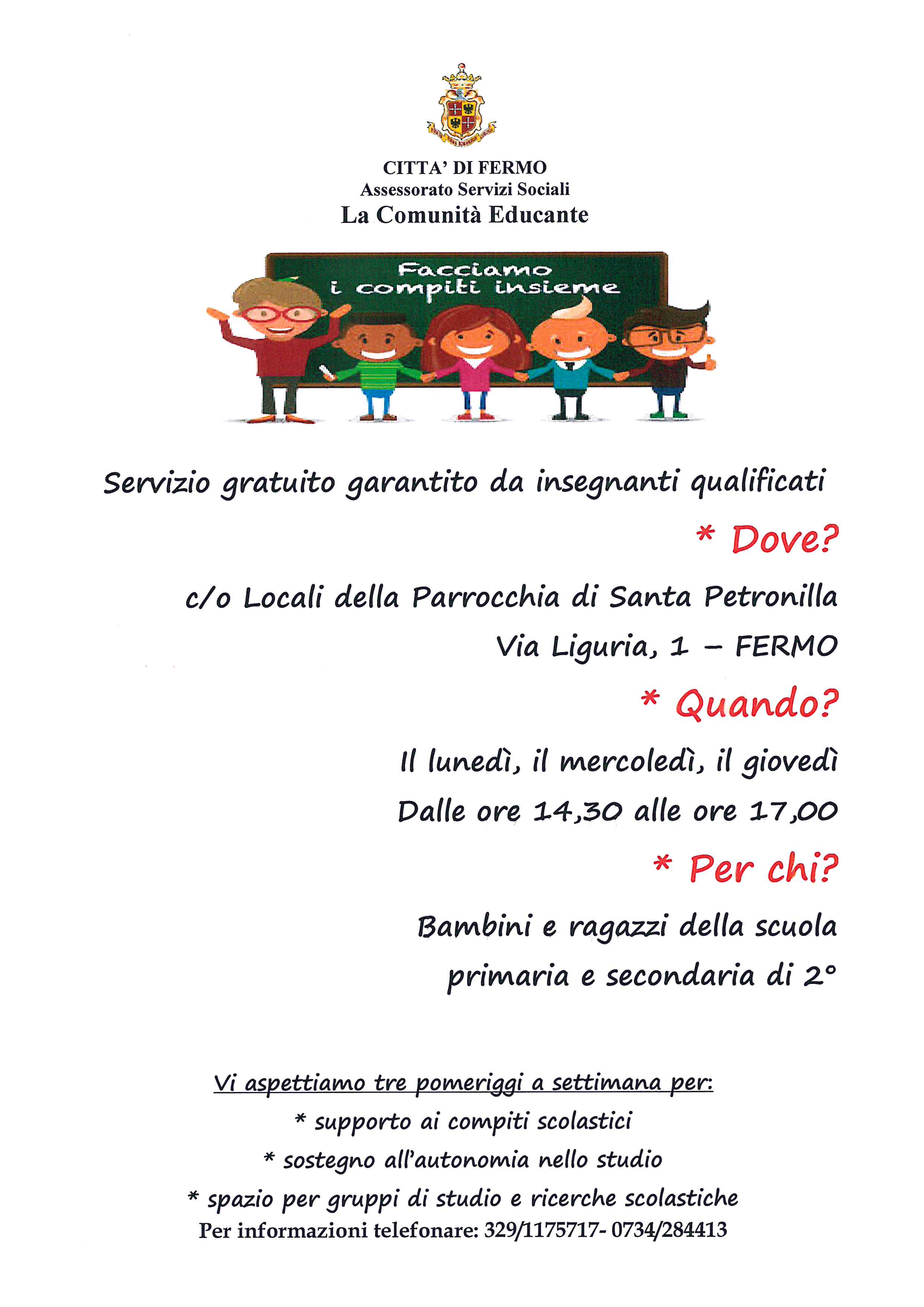 L'Assessorato ai Servizi Sociali del Comune di Fermo promuove il progetto "Facciamo i compiti insieme", un servizio gratuito qualificato di supporto ai compiti scolastici e all'autonomia nello studio.