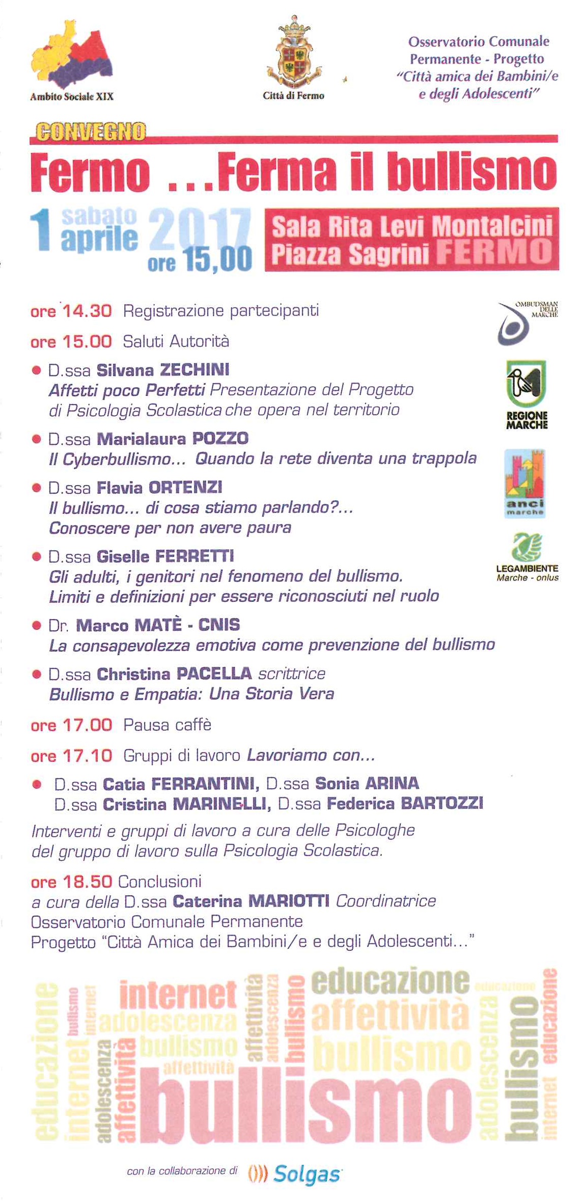 Il Comune di Fermo, in collaborazione con l'Osservatorio Comunale Permanente - Progetto "Città amica dei Bambini/e e degli Adolesscenti e l' Ambito Territoriale Sociale XIX, organizzano il Convegno "Fermo... Ferma il bullismo ", Sabato 1 Aprile 2017 ore 15:00, presso la Sala "Rita Levi Montalcini" Piazza Sagrini di Fermo.