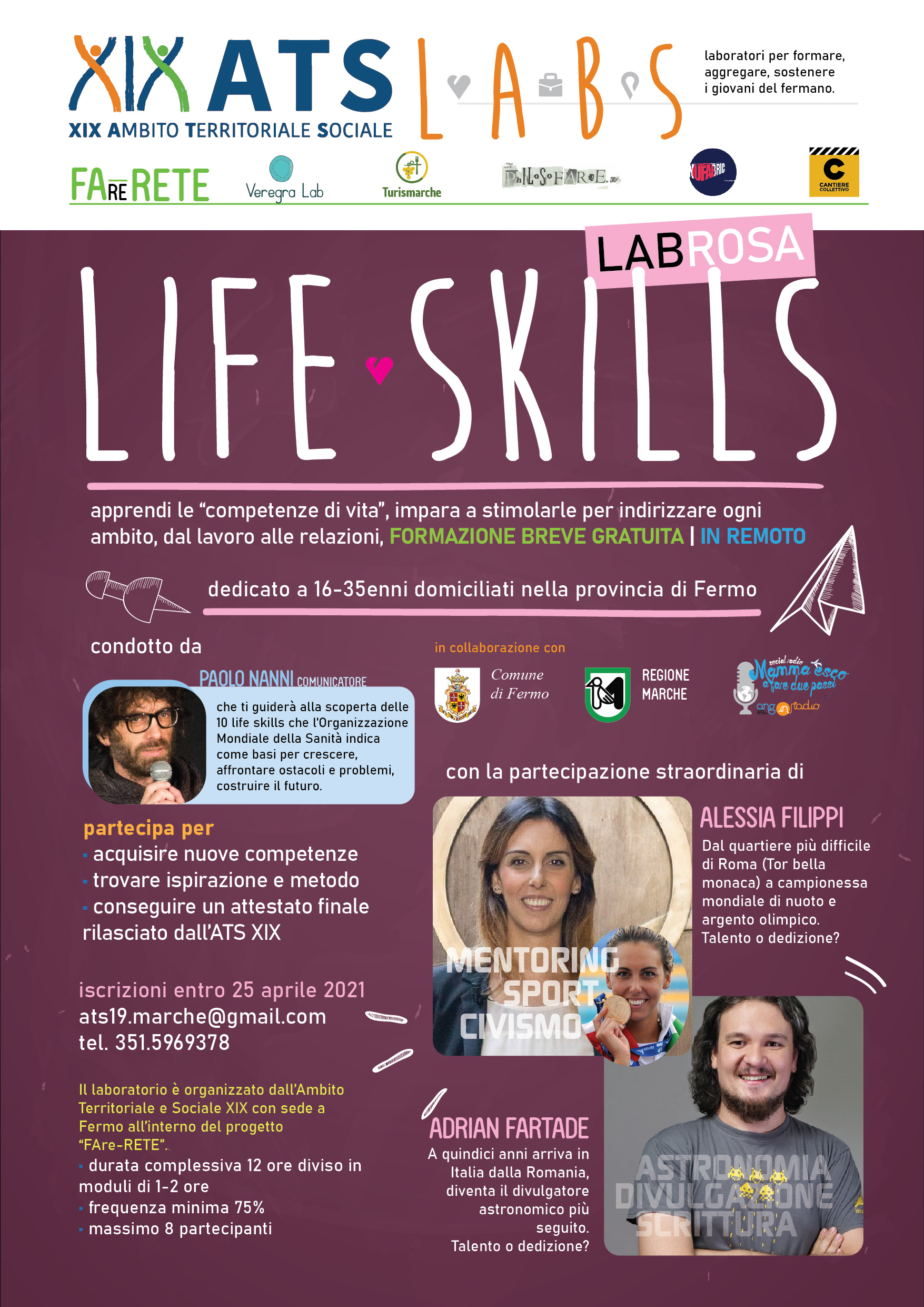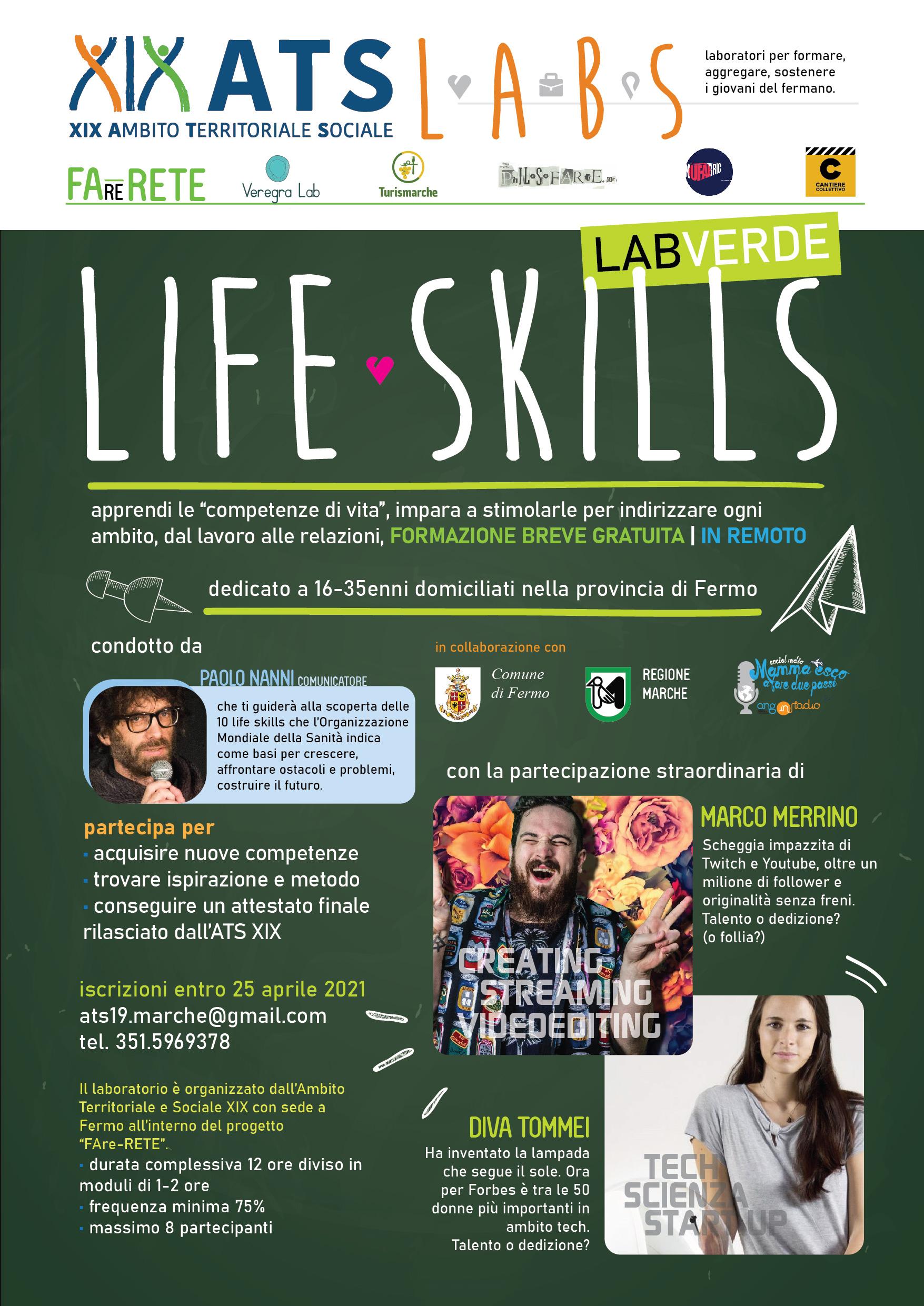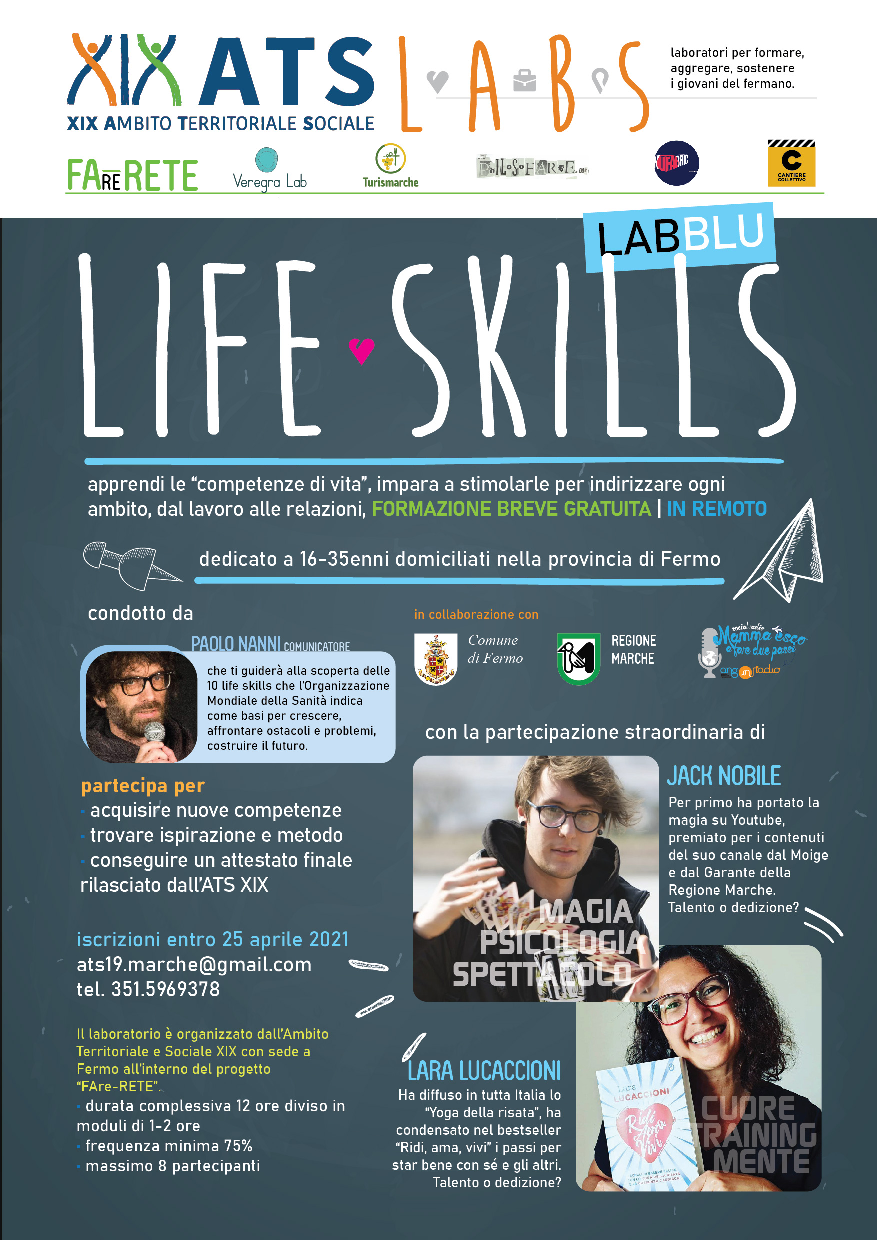 LIFE SKILLS fa parte del nuovo contenitore ATS-LABS - laboratori per formare, aggregare, sostenere i giovani del fermano con cui l’Ambito Territoriale Sociale XIX vuole fornire ai giovani competenze trasversali. Dunque opportunità per formarsi e per entrare in contatto con politiche giovanili che l’Ambito sta portando avanti, per mettersi in luce e iniziare un cammino che potrebbe sfociare in occasioni concrete di ulteriore formazioni, esperienze e lavoro.