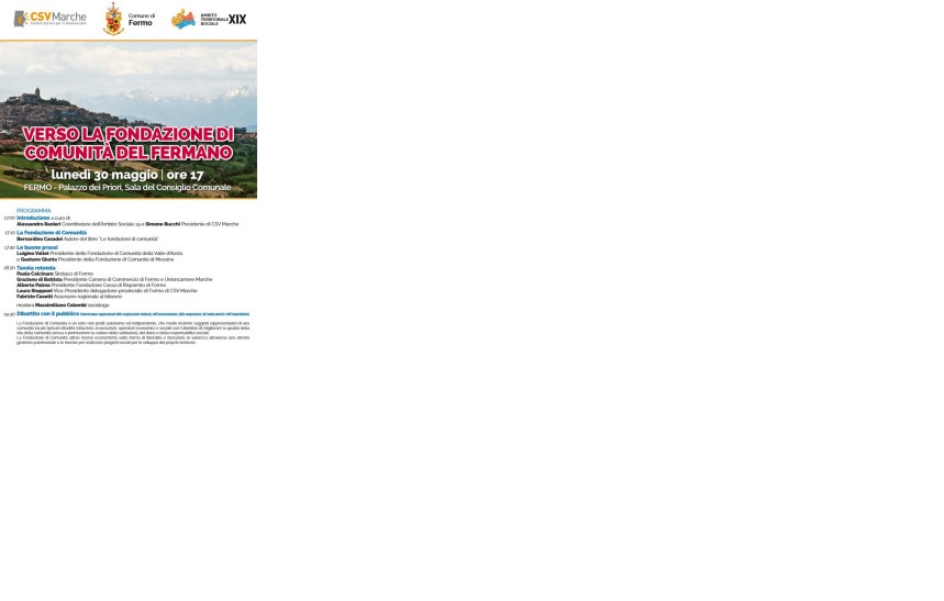In merito a tale progetto, insieme alla collaborazione con il CSV Marche, il Comune di Fermo e l'ATS XIX, lunedì 30 maggio ore 17 a Fermo, nella Sala del Consiglio Comunale di Palazzo dei Priori, si è svolta l’iniziativa “Verso la Fondazione di comunità del fermano”, dove è stato siglato l’avvio di un percorso che tenda alla costituzione di una Fondazione di comunità, con lo scopo di valorizzare il capitale sociale della comunità locale.